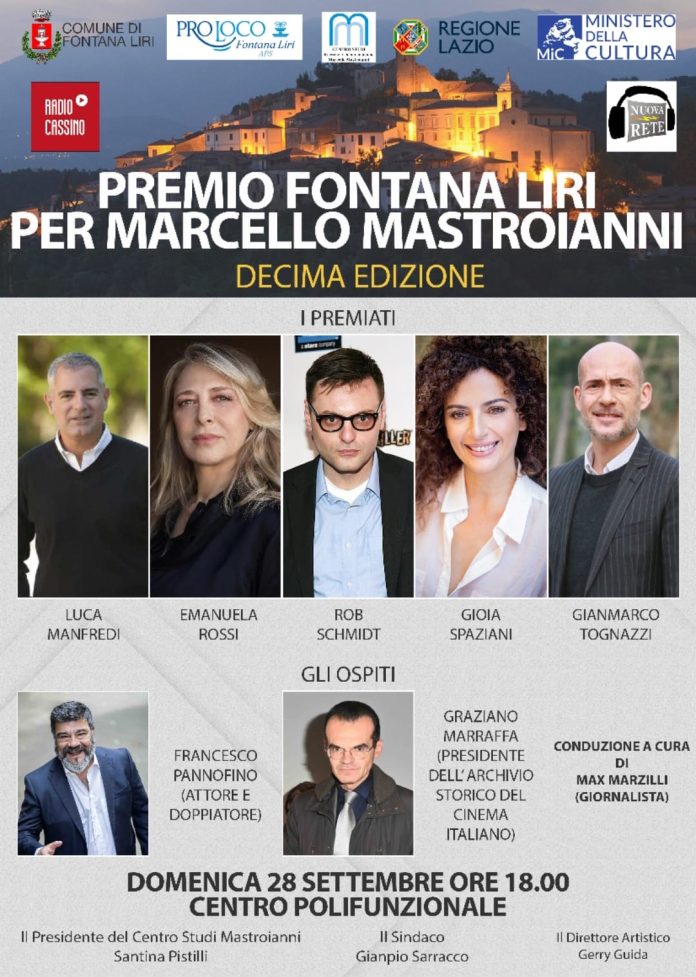 Si è svolta presso il Centro Polifunzionale di Fontana Liri la decima edizione del“Premio Fontana Liri per Marcello Mastroianni”, condotta dal giornalista Max Marzilli. Nato nel 2016 grazie all’impegno dell’Amministrazione Comunale guidata dal sindaco Gianpio Sarracco e al Centro Studi Marcello Mastroianni diretto da Santina Pistilli, il premio è realizzato con la collaborazione della Pro Loco, la direzione artistica di Gerry Guida, il coordinamento di Francesca Piggianelli, presidente dell’Associazione Culturale Romarteventi, e l’ideazione dell’artista Franco Bianchi Poteca.