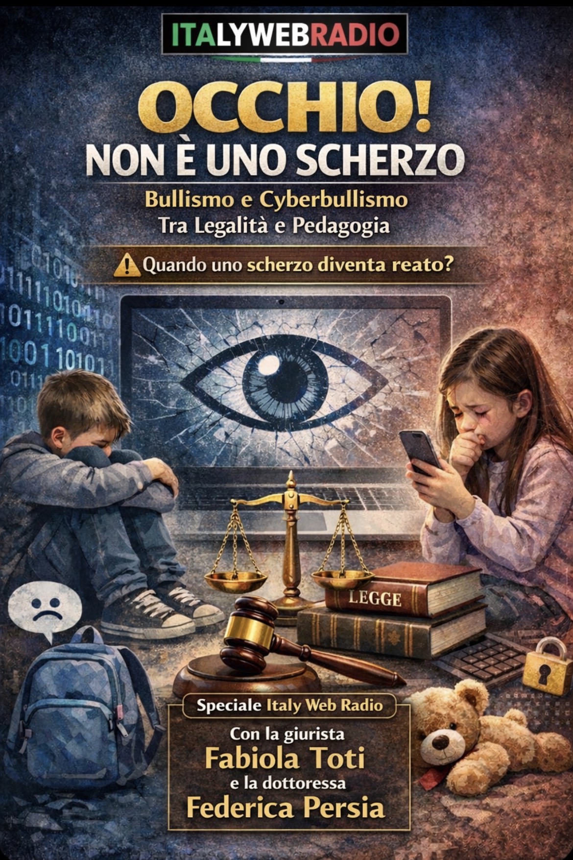 Il percorso che abbiamo intenzione di intraprendere con la mia amica giurista Dott.ssa Fabiola Toti sarà incentrato sul BULLISMO. La nostra rubrica, su ITALY WEB RADIO, "Occhio, non è uno scherzo!" vuole essere un salotto virtuale in cui avremo modo di incontrarci e confrontarci. Sarà uno spazio in cui cercheremo di affrontare, sotto il profilo pedagogico e giuridico, le diverse problematiche che ruotano attorno al Bullismo. Ci sono parole che fanno male più di uno schiaffo e storie che spesso restano nel silenzio. Noi daremo voce a chi, molto spesso, non viene ascoltato. Affronterò, sotto il profilo pedagogico diverse tematiche: il fenomeno del bullismo e del cyberbullismo, il coraggio di essere diversi, perché diverso non significa sbagliato, il silenzio che ferisce, le cicatrici invisibili, l'importanza del gruppo e del pensiero critico, l'aspetto centrale dell' educazione e del rispetto. Conosceremo e analizzeremo, sotto il profilo pedagogico-familiare, storie di ragazzi vittime di bullismo e... tanto altro ancora. Vi aspettiamo in tanti, nella nostra rubrica settimanale "OCCHIO, NON È UNO SCHERZO!", per condividere con voi momenti di riflessione, ma anche e soprattutto considerazioni personali. Grazie❤